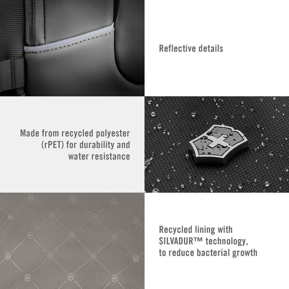 Altmont Modern City Daypack wykonany został z (rPET) – lepszej alternatywy dla poliestru tradycyjnego, która jest równie wytrzymała co czysty poliester, nawet pod względem elastyczności, odporności na przetarcia i trwałości koloru. City Daypack z podstawą z laminowanego poliestru charakteryzuje się wodoszczelnością, wysoką odpornością na przetarcia oraz niezwykłą wytrzymałością na rozciąganie. Aby zapobiec namnażaniu się drobnoustrojów w materiale, podszewka antybakteryjna została wykonana w technologii SILVADUR™. Ten nowoczesny model jest całkowicie wodoszczelny, łatwy do mycia i pomieści wszystkie akcesoria potrzebne w drodze do pracy.