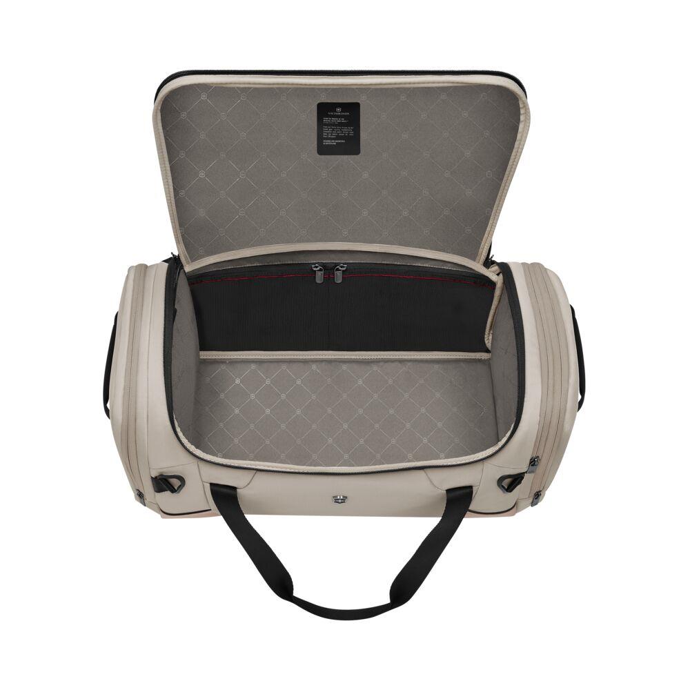 Możesz wybrać sposób, w jaki będzie noszony – jako torba podróżna lub plecak – dostosowując go odpowiednio do swoich potrzeb za pomocą odczepianego pasa na ramię, wyściełanych rączek i praktycznych uchwytów bocznych. W środku znajdują się wewnętrzne kieszenie z siateczki mesh, łatwa do mycia dedykowana komora na obuwie, podszewka antybakteryjna i organizer na niezbędniki biznesowe (obejmujący kieszeń na słuchawki i brelok).
