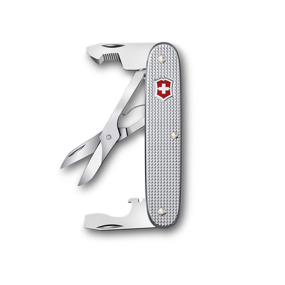 Model scyzoryka,posiada innowacyjny otwieracz do pudełek. Narzędzie posiada zaokrąglony czubek z ostrą krawędzią,która otworzy niemal każdą paczkę,kopertę lub owiniętą folią przesyłkę.Ząbkowana krawędź przyda się do przecinania kartonu i plastikowych pasków a płaski śrubokręt pozwoli usunąć zszywki z dokumentów.